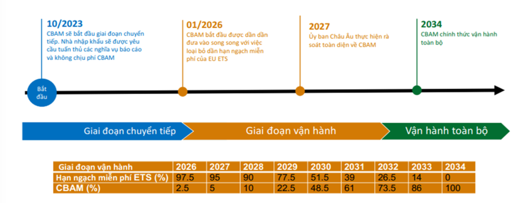 - Giai đoạn vận hành chính thức (từ 1/1/2026): CBAM bắt đầu có hiệu lực đầy đủ. Các nhà nhập khẩu phải mua chứng chỉ CBAM và thanh toán chi phí carbon cho hàng hóa nhập khẩu. Theo quy định được đơn giản hóa, các doanh nghiệp có thể tiếp tục nhập khẩu sau ngày 1/1/2026 nếu họ nộp đơn xin cấp phép trước ngày 31/3/2026.