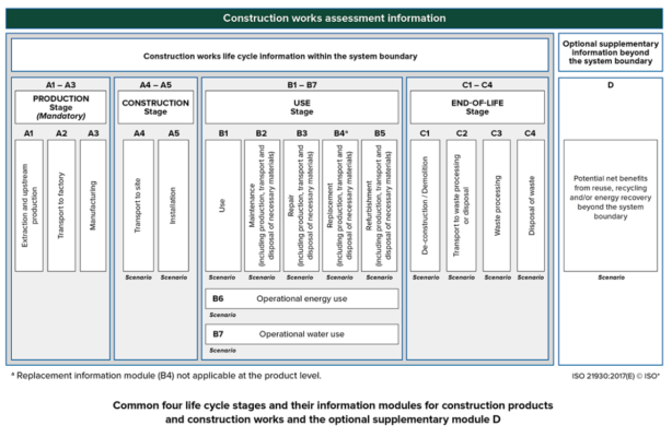 Các Module từ A1 đến C4 tạo thành ranh giới hệ thống đại diện đầy đủ cho vòng đời tòa nhà, hay còn gọi là “từ nôi đến mộ” (cradle-to-grave).