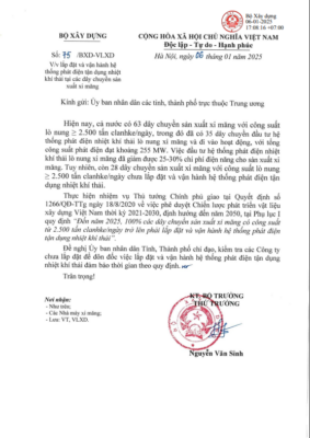 Tuy nhiên, vẫn còn 28 dây chuyền sản xuất xi măng với công suất lò nung khoảng 2.500 tấn clanhke/ngày chưa lắp đặt và vận hành hệ thống phát điện tận dụng nhiệt khí thải. Đầu năm 2025, Bộ Xây dựng đã có văn bản số 75/BXD-VLXD gửi UBND các tỉnh, thành phố trực thuộc Trung ương về việc lắp đặt và vận hành hệ thống phát điện tận dụng nhiệt khí thải tại các dây chuyền sản xuất xi măng.