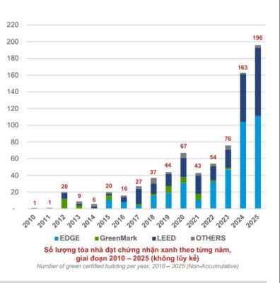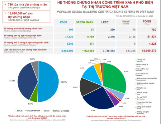 Năm 2025 chứng kiến sự bùng nổ mạnh mẽ của thị trường công trình xanh tại Việt Nam với các con số ấn tượng. Theo đó, Việt Nam ghi nhận thêm 196 tòa nhà đạt chứng nhận xanh (tăng 20% so với năm 2024) và 4,4 triệu m² diện tích sàn (GFA) (tăng 15%). Trong đó, chứng nhận EDGE dẫn đầu thị trường với 50,51% thị phần. LEED đứng thứ hai với 37,18%. Green Mark chiếm 6,54% và các chứng nhận khác chiếm 5,77%.